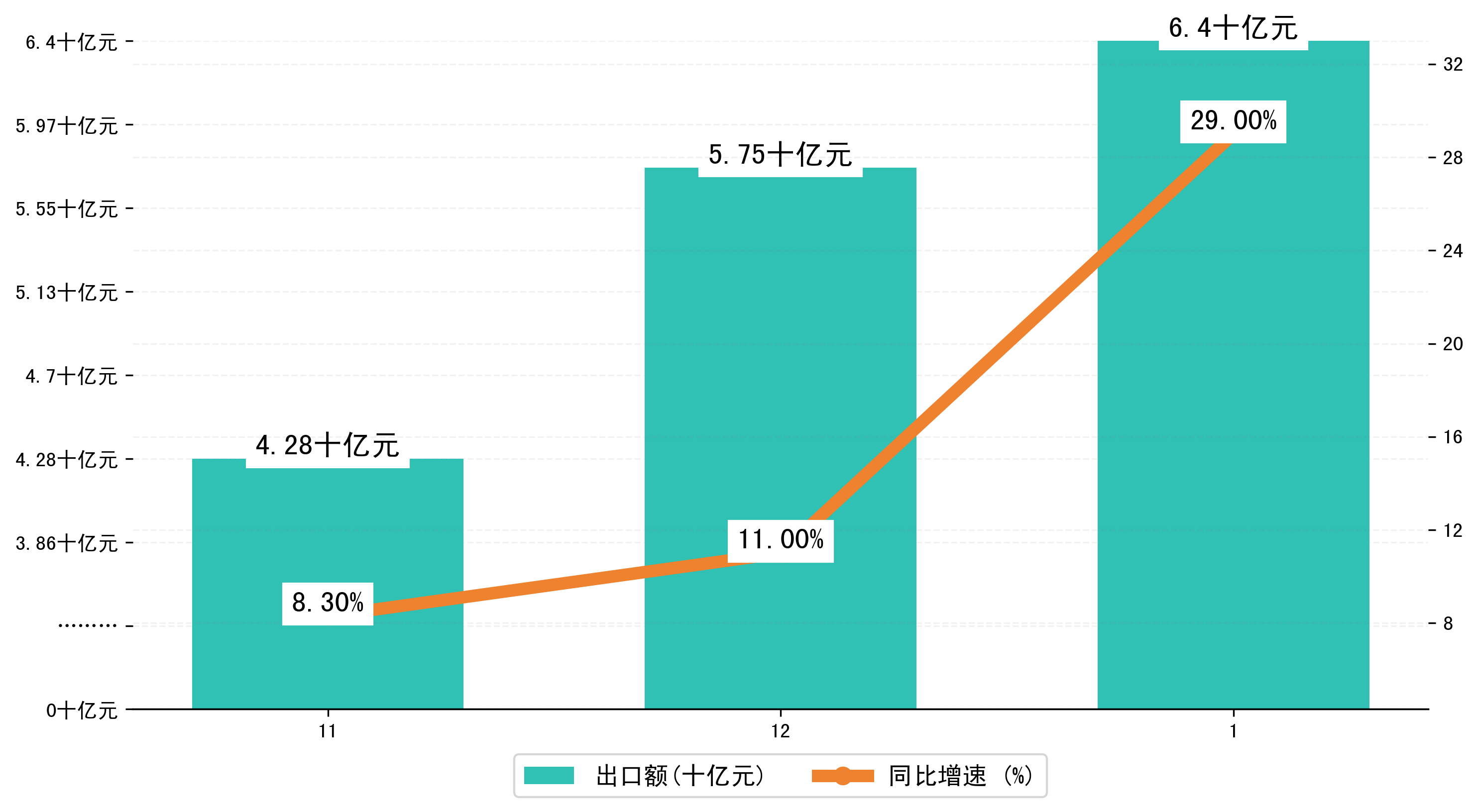 以人民币计,2025年1-1月沈阳市出口额为63,9738.8545万元,相比上年同期增加了14,3696.2169万元,同比增加了29.00%。