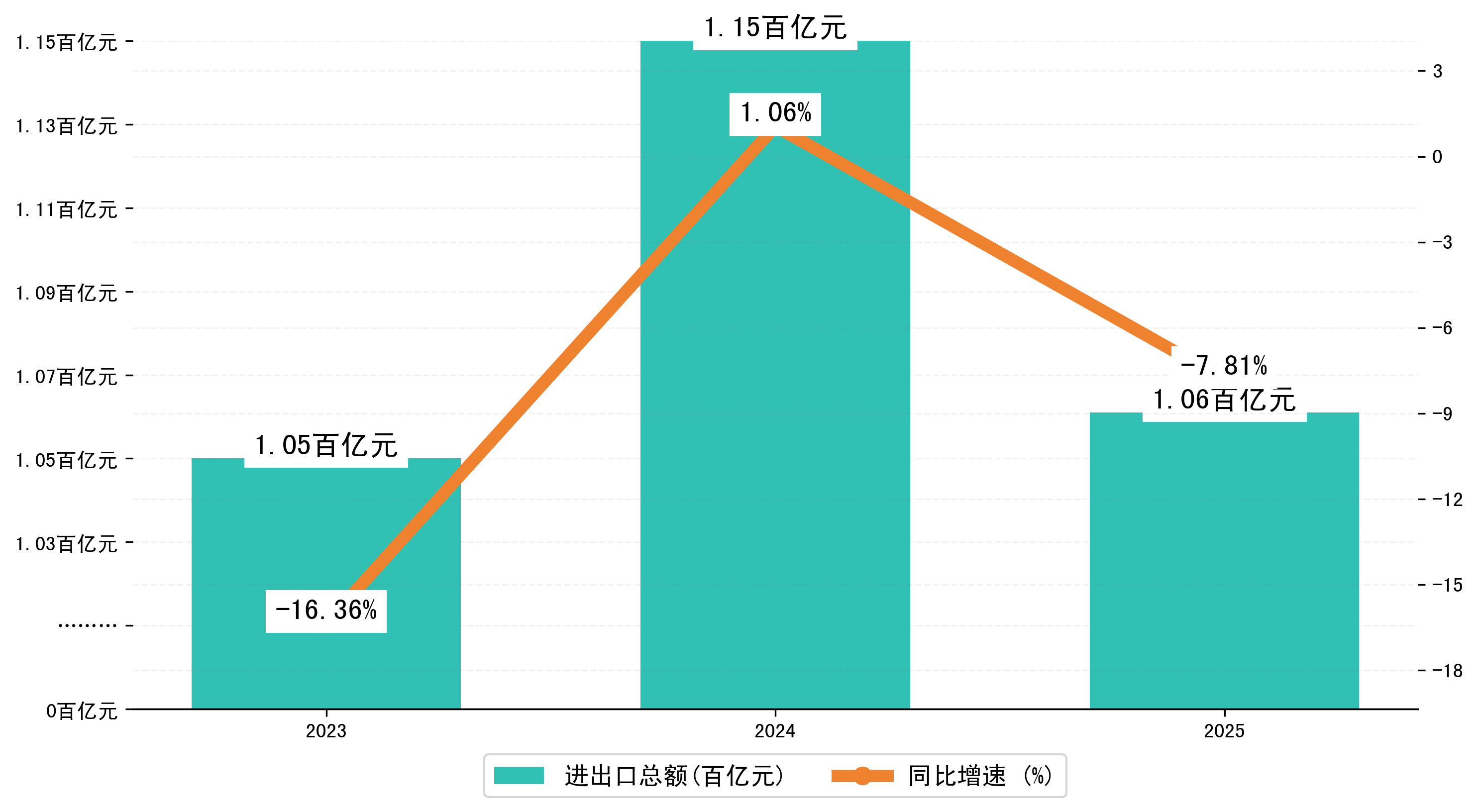 以人民币计,2025年1-1月沈阳市进出口总额为106,2857.3015万元,相比上年同期减少了8,9993.3007万元,同比减少了-7.70%。