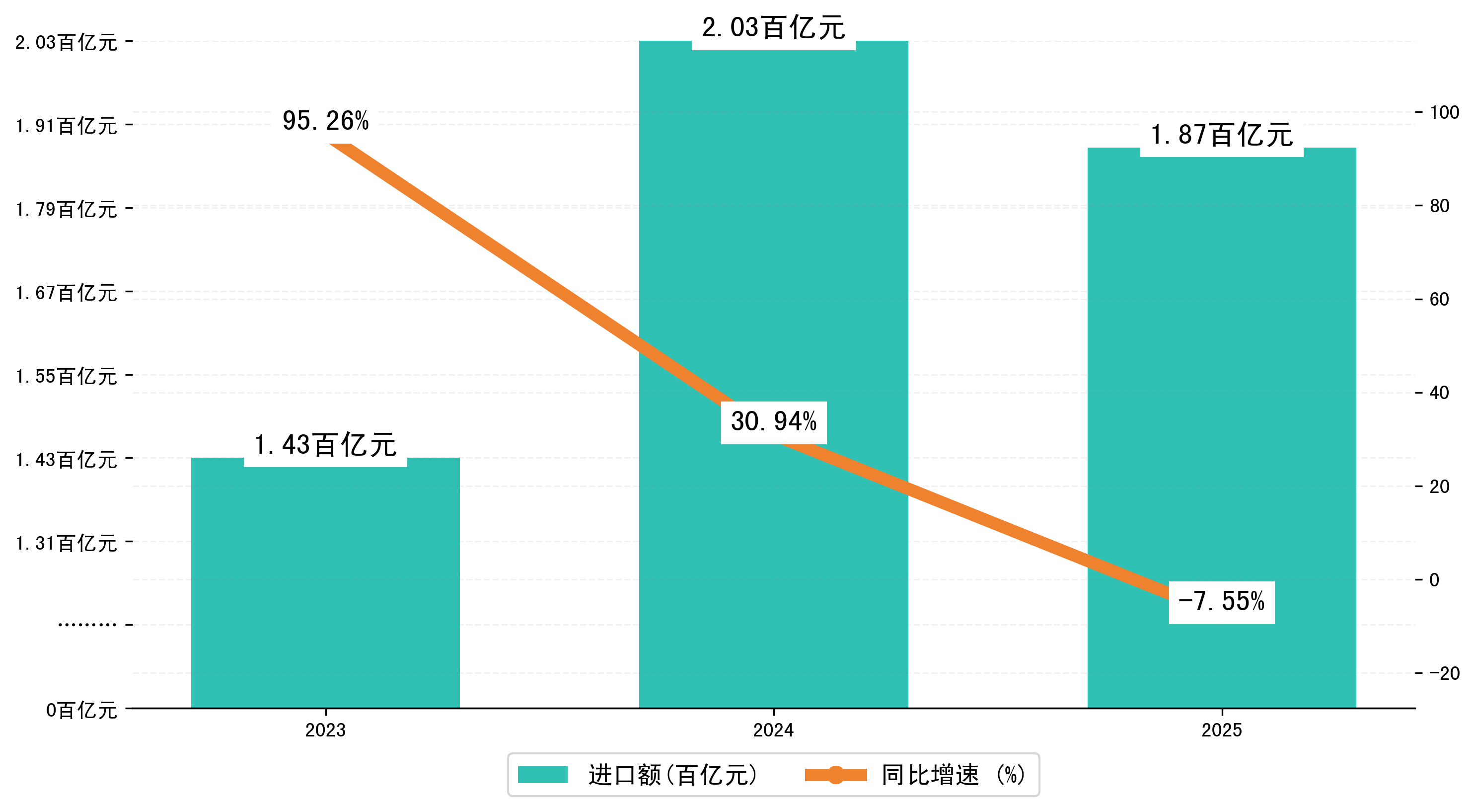 以人民币计,2025年1-4月新疆维吾尔自治区进口额为187,3567.5517万元,相比上年同期减少了15,3000.4461万元,同比减少了-8.30%。