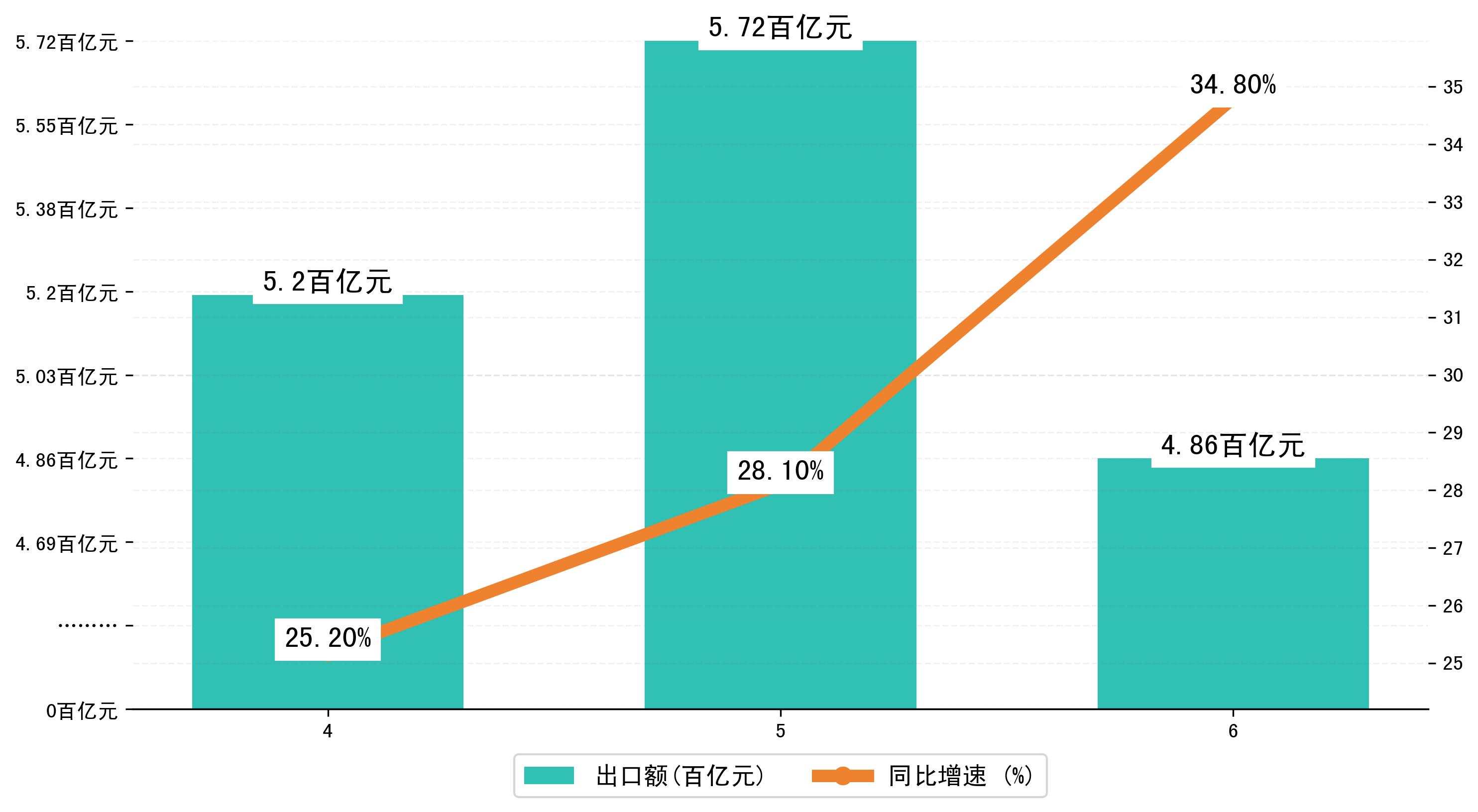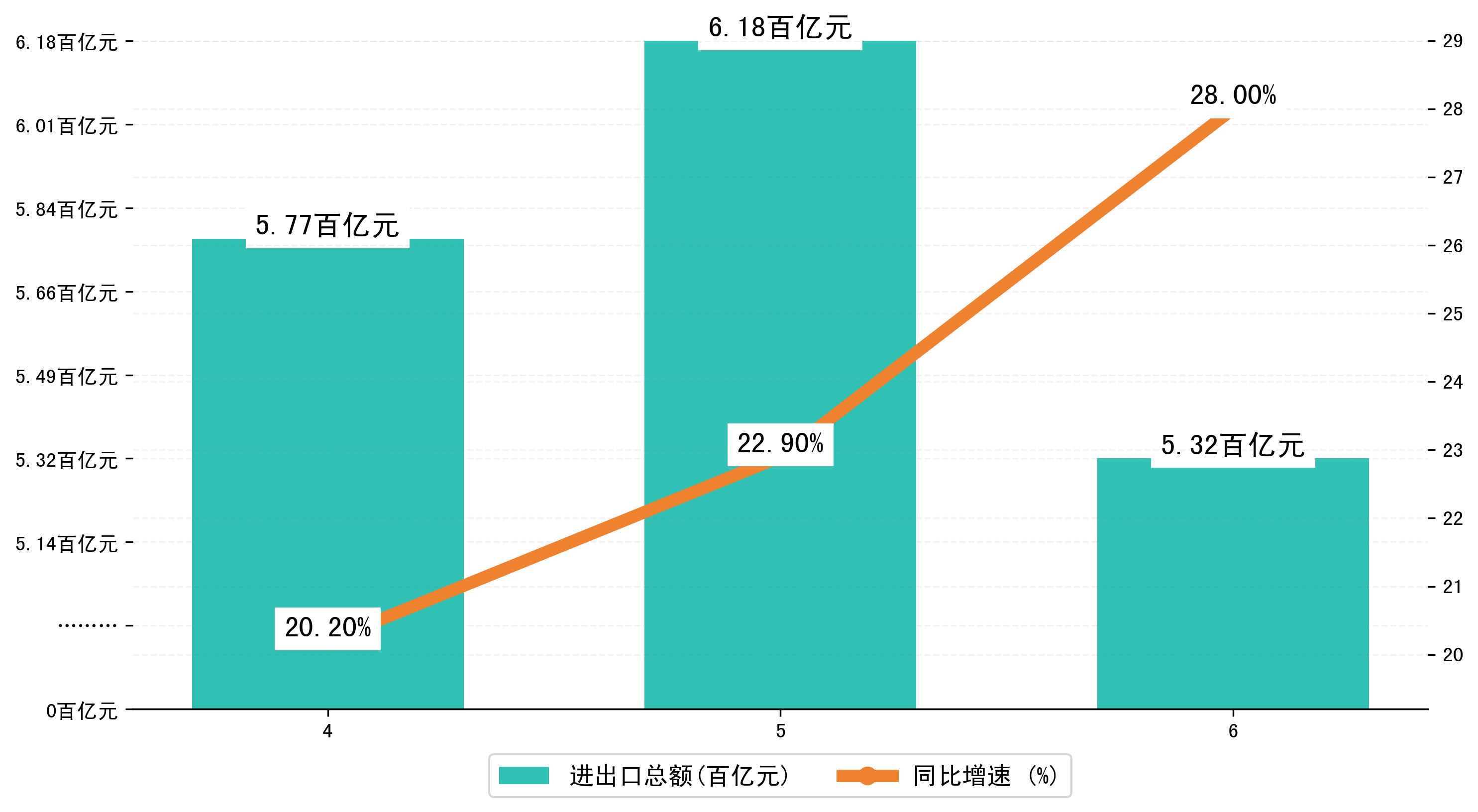 以人民币计,2025年6月新疆维吾尔自治区进出口总额为531,6733.3648万元,相比上月减少了86,4068.6803万元;相比上年同期增加了181,6657.6076万元,同比增加了28.00%。