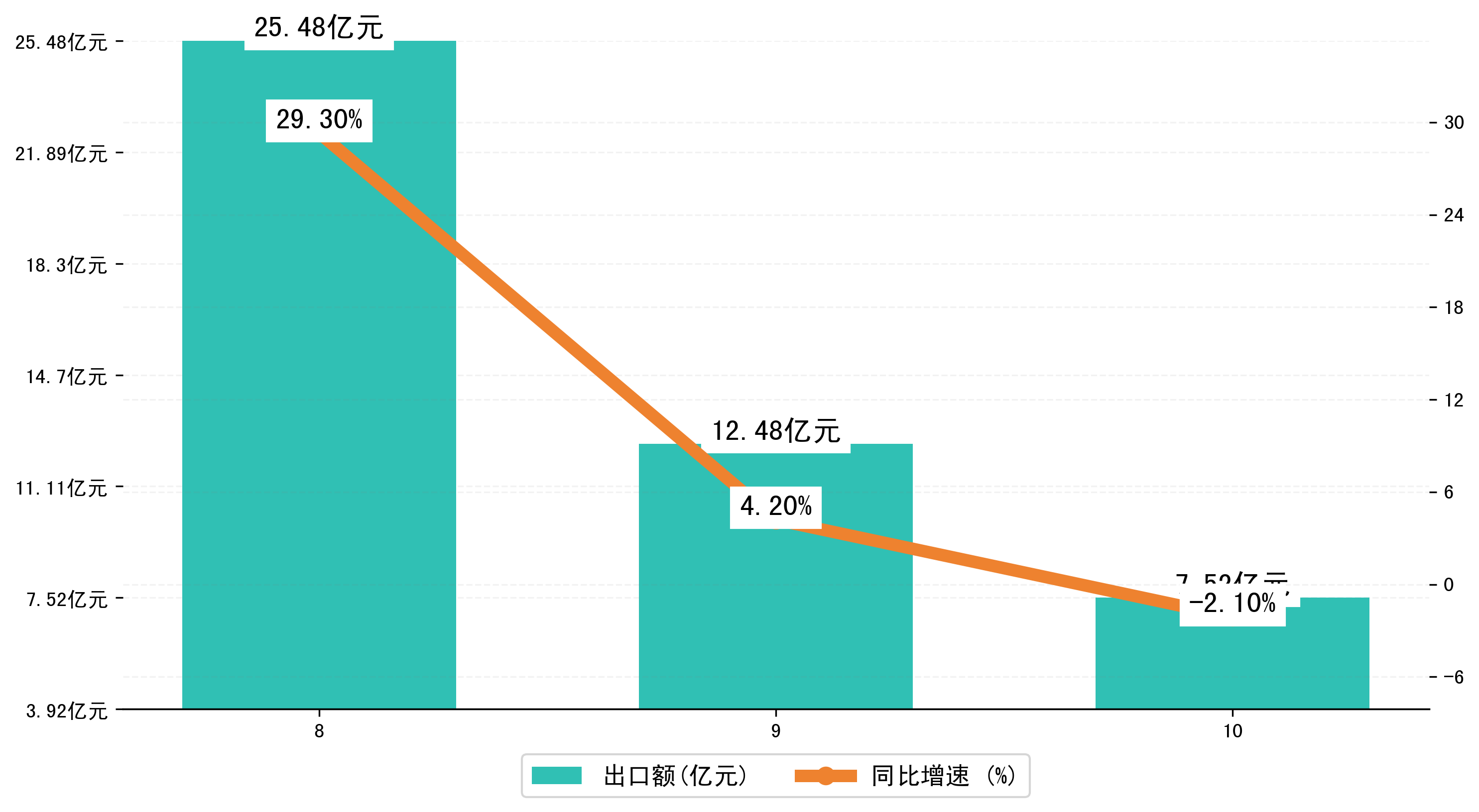 以人民币计,2024年10月西藏自治区贸易差额为6,4488,0527万元(贸易顺差),相比上月减少了4,1921,1511万元,即5844,9824万美元;相比上年同期减少了1,1168,4104万元,同比减少-14.76%。