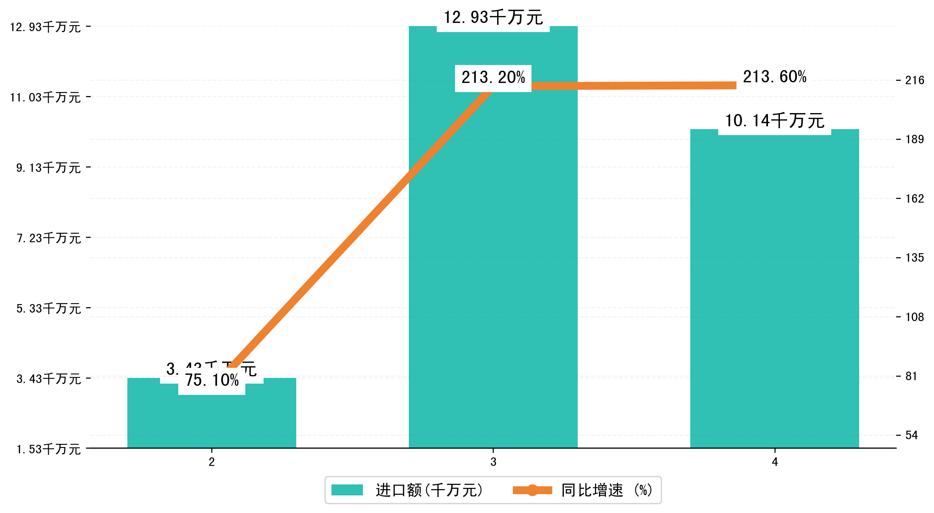 以人民币计,2024年4月西藏自治区进口额为1,0143.4566万元,相比上月减少了2788.6054万元;相比上年同期增加了6929.9368万元,同比增加了213.60%。