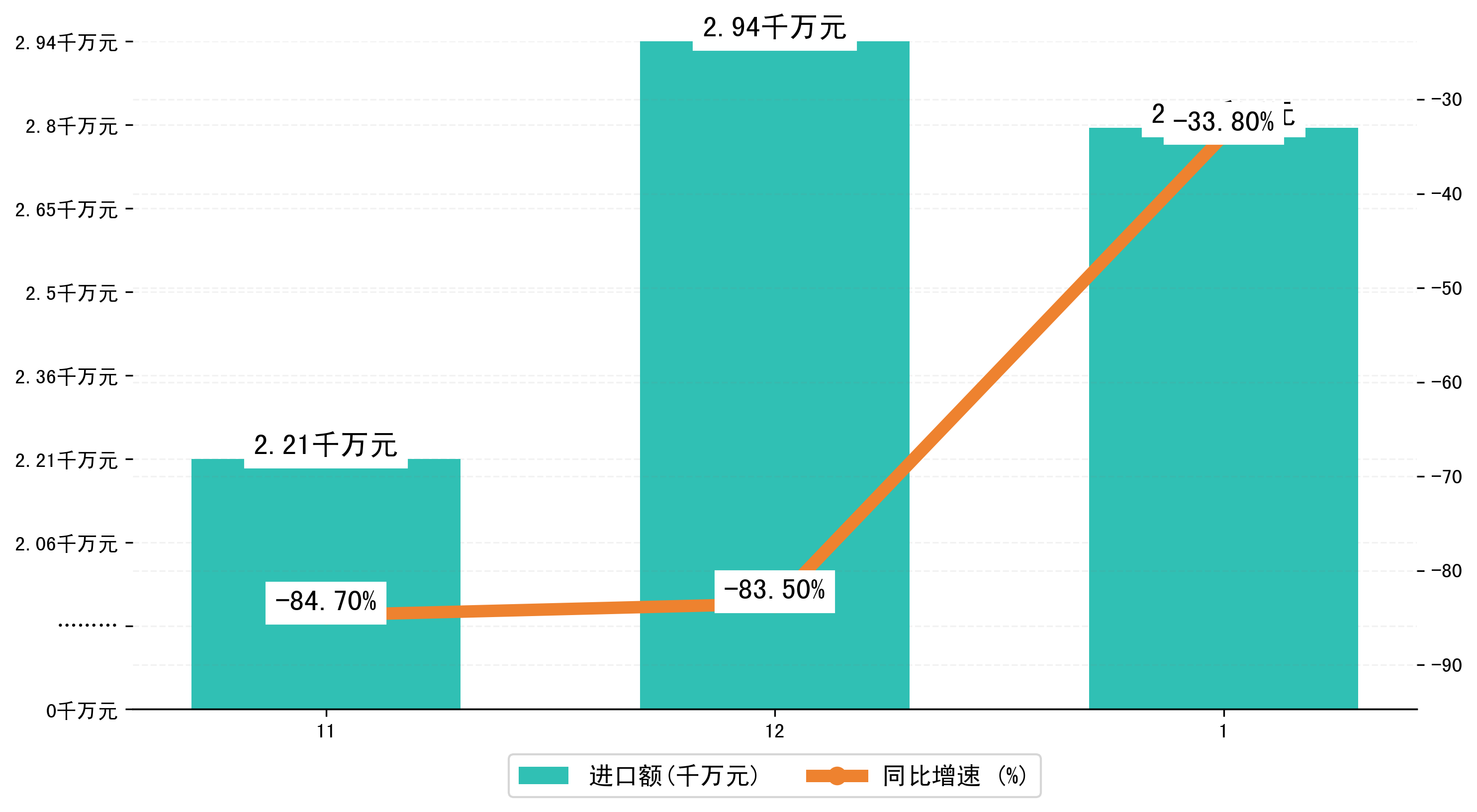 以人民币计,2023年1-1月西藏自治区进口额为2790.9892万元,相比上年同期减少了1422.1816万元,同比减少了-33.80%。