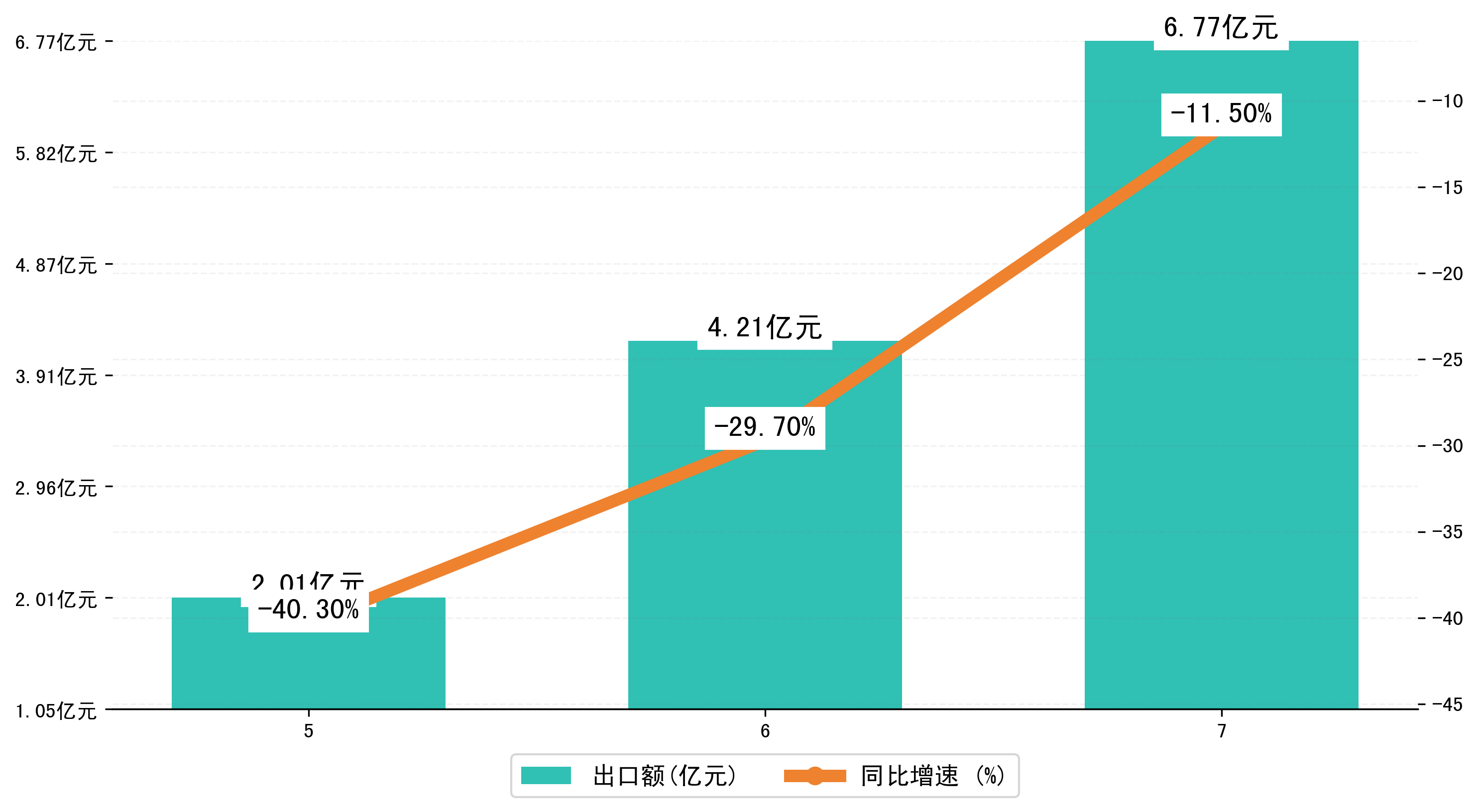 以人民币计,2023年7月西藏自治区出口额为6,7736.4636万元,相比上月增加了2,5665.9435万元;相比上年同期增加了3,3298.2405万元,同比减少了-11.50%。