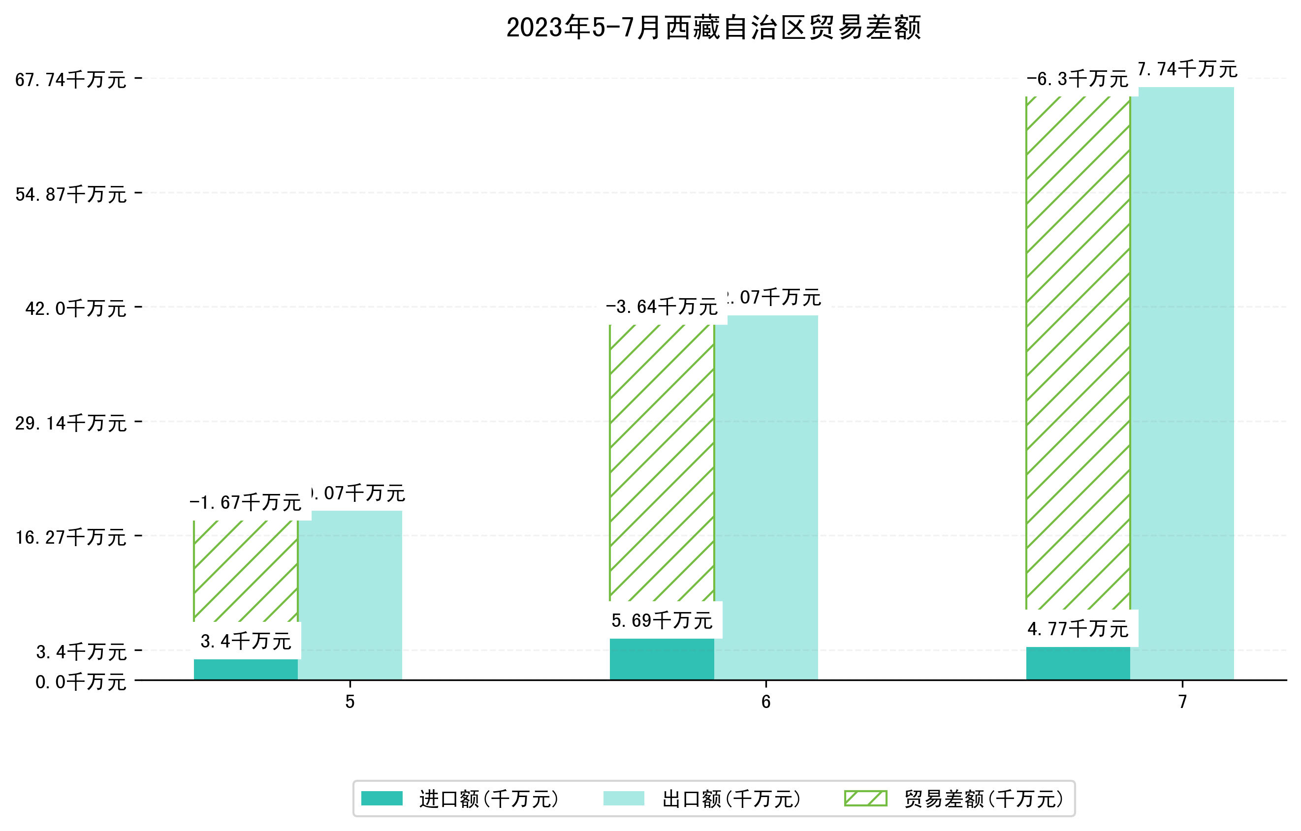 以人民币计,2023年7月西藏自治区贸易差额为6,2964,8652万元(贸易顺差),相比上月增加了2,6584,5827万元,即3573,2127万美元;相比上年同期增加了3,1303,3270万元,同比增加98.87%。