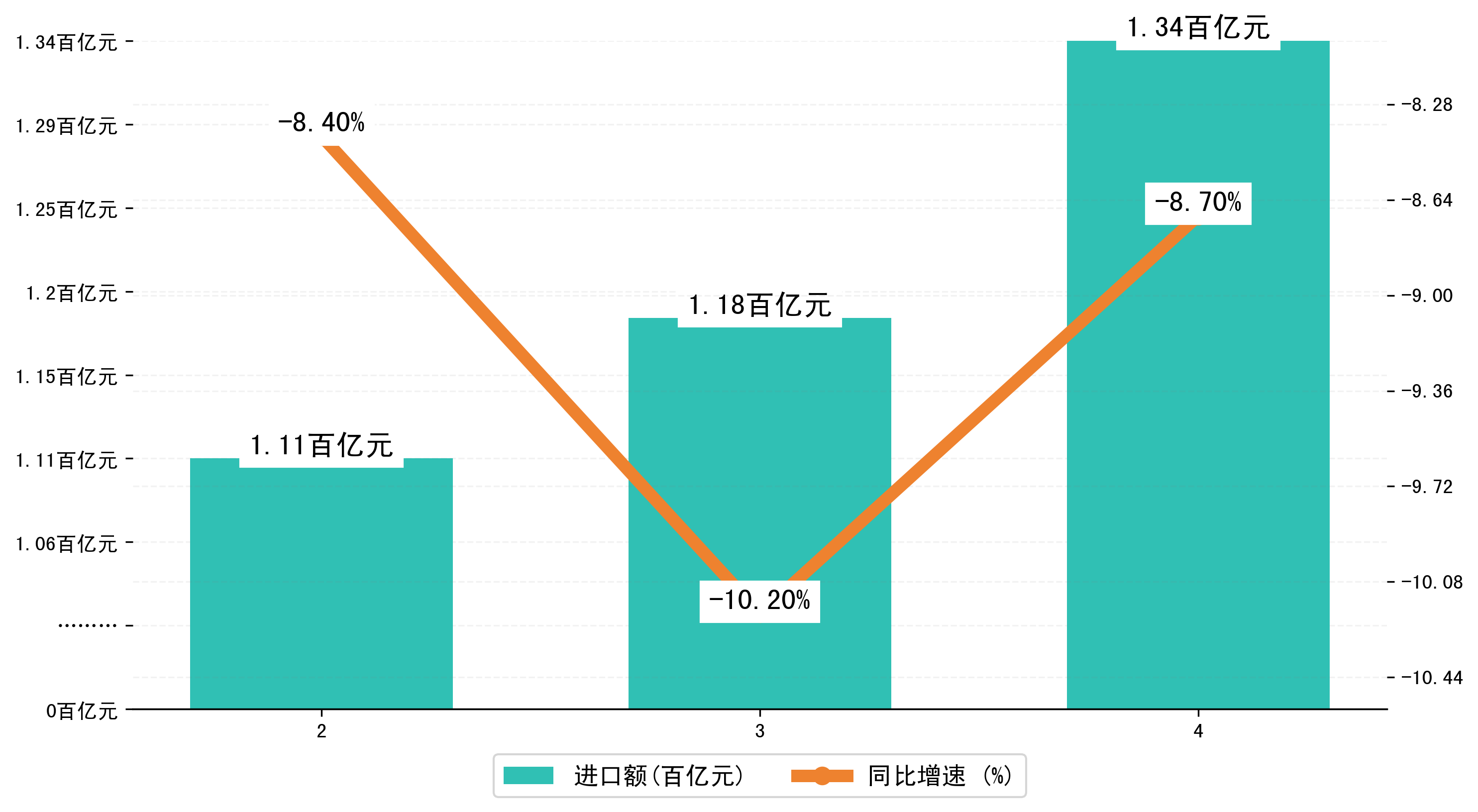 以人民币计,2024年4月云南省进口额为134,1041.3007万元,相比上月增加了15,6631.7267万元;相比上年同期减少了7,1570.0792万元,同比减少了-8.70%。