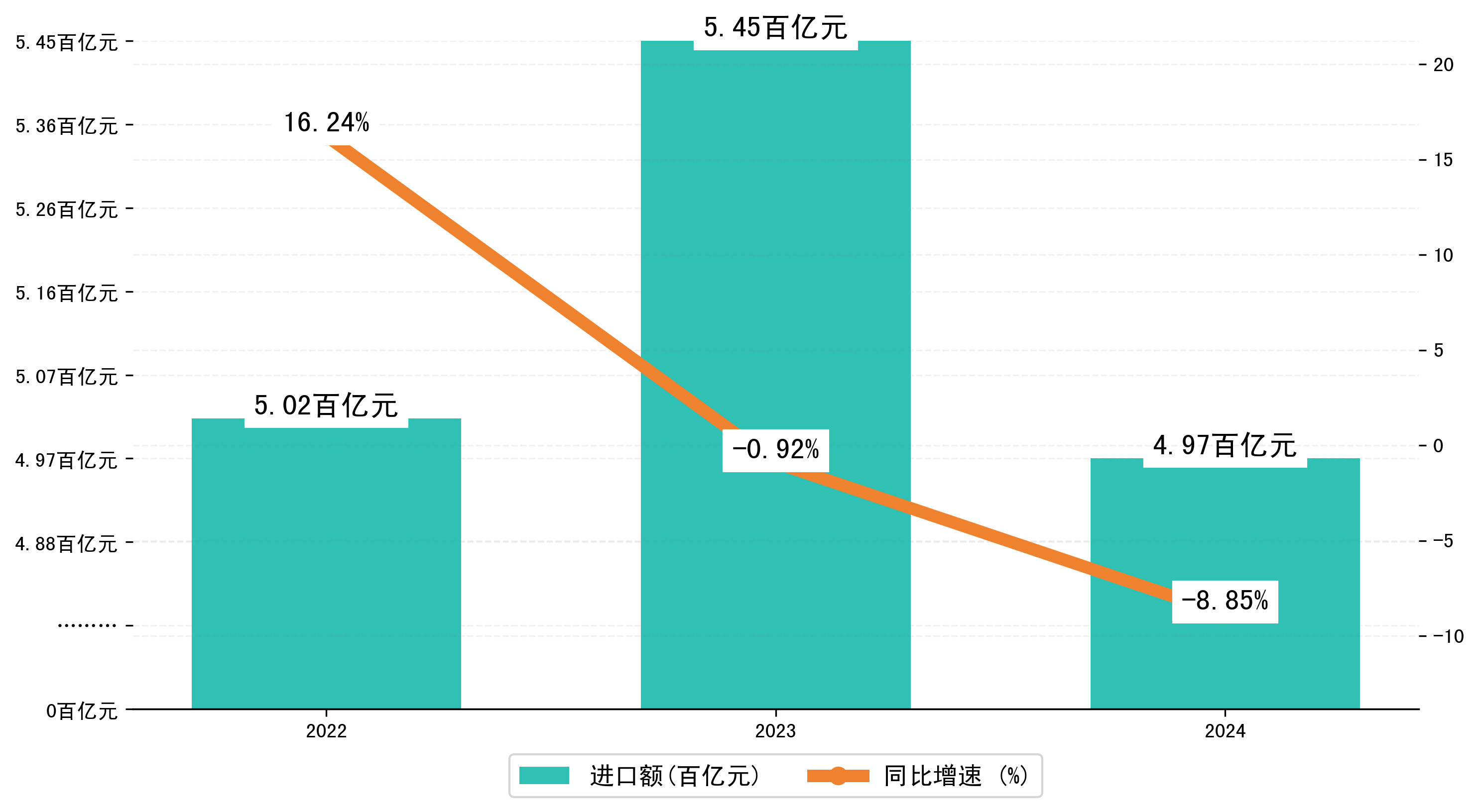 以人民币计,2024年1-4月云南省进口额为497,1860.6137万元,相比上年同期减少了48,2696.8855万元,同比减少了-8.70%。