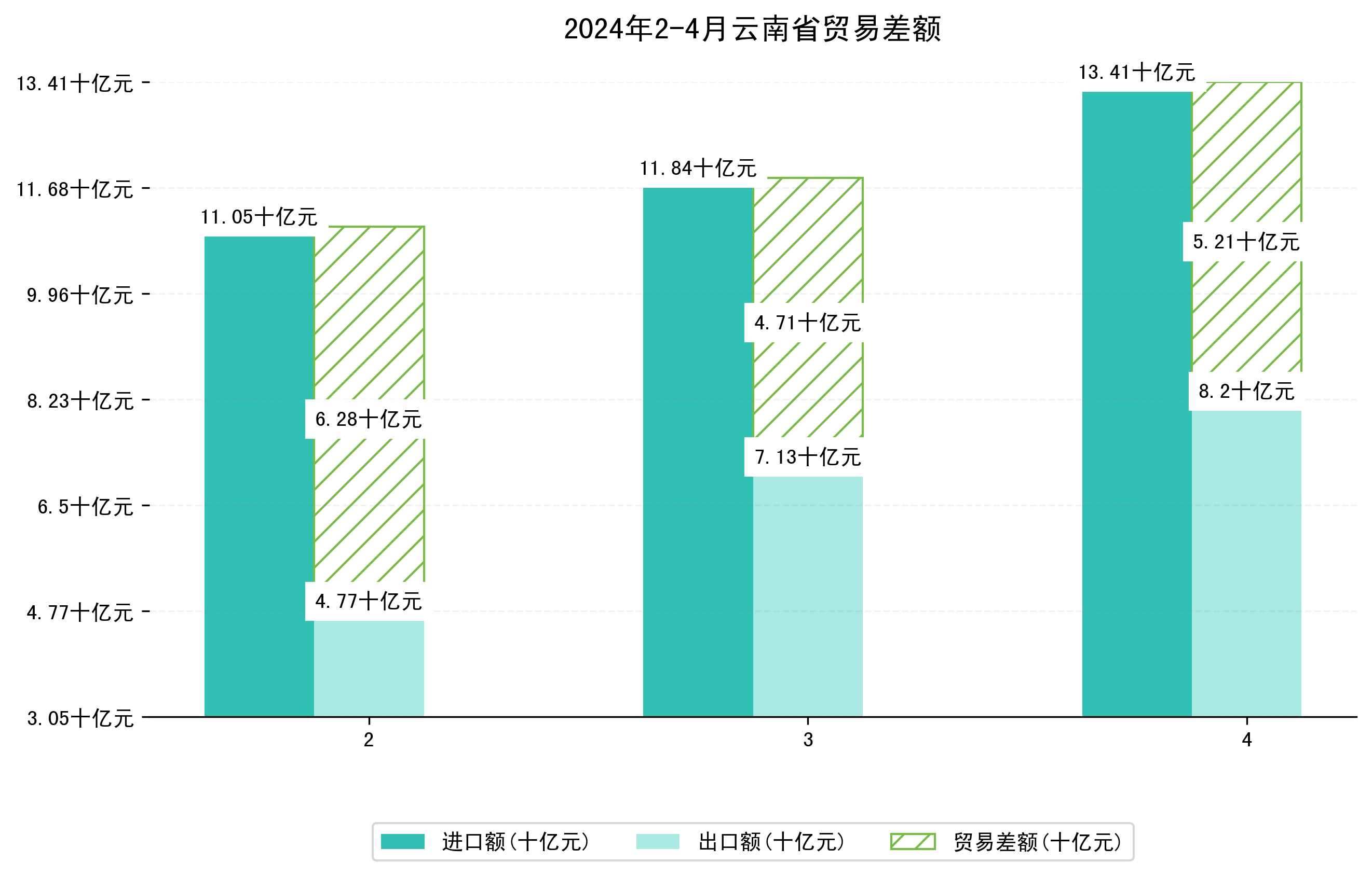 以美元计,2024年1-4月云南省贸易差额为31,3472,8470万美元(贸易逆差),相比上年同期增加了9,4358,1798万美元,同比增加-23.14%。