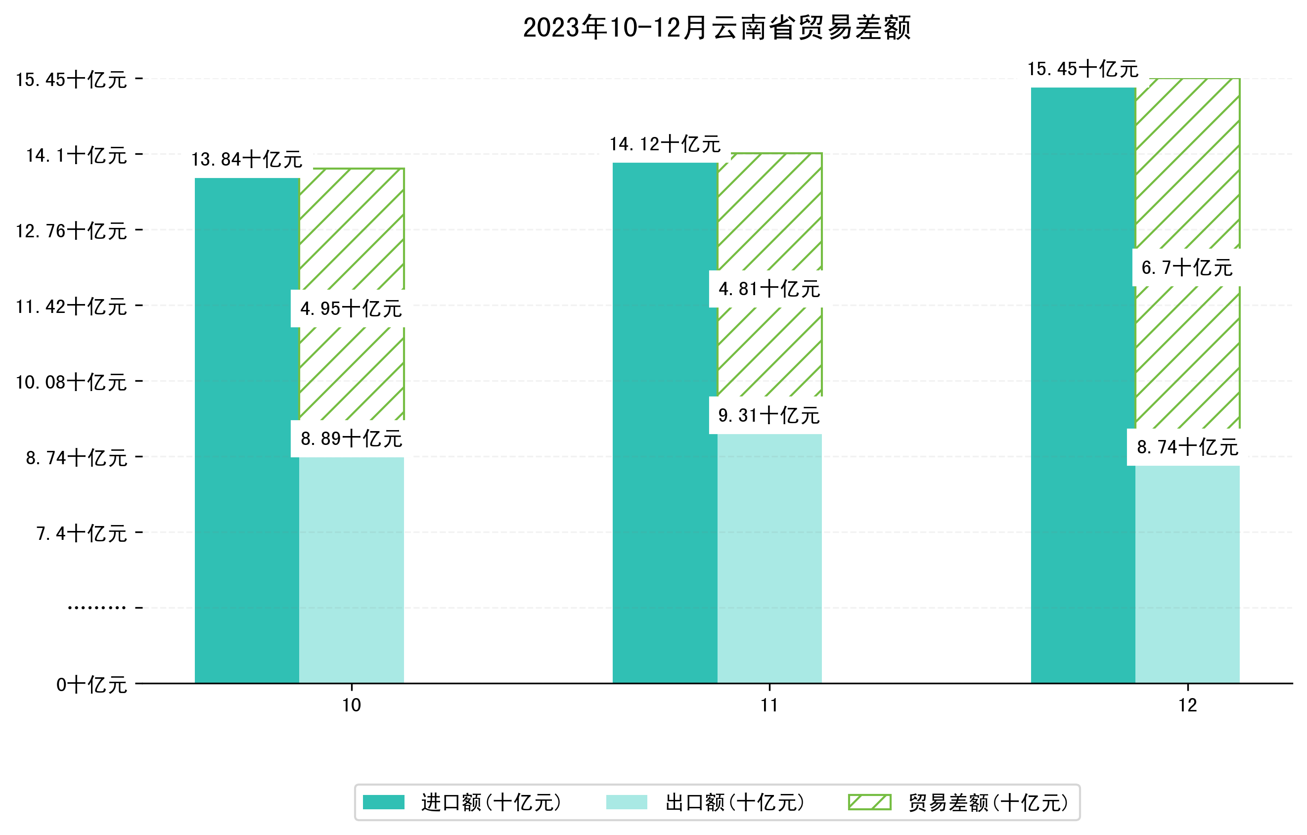 以人民币计,2023年12月云南省贸易差额为67,0158,4391万元(贸易逆差),相比上月减少了18,9398,8454万元,即2,6772,4631万美元;相比上年同期减少了21,2526,8747万元,同比减少46.44%。