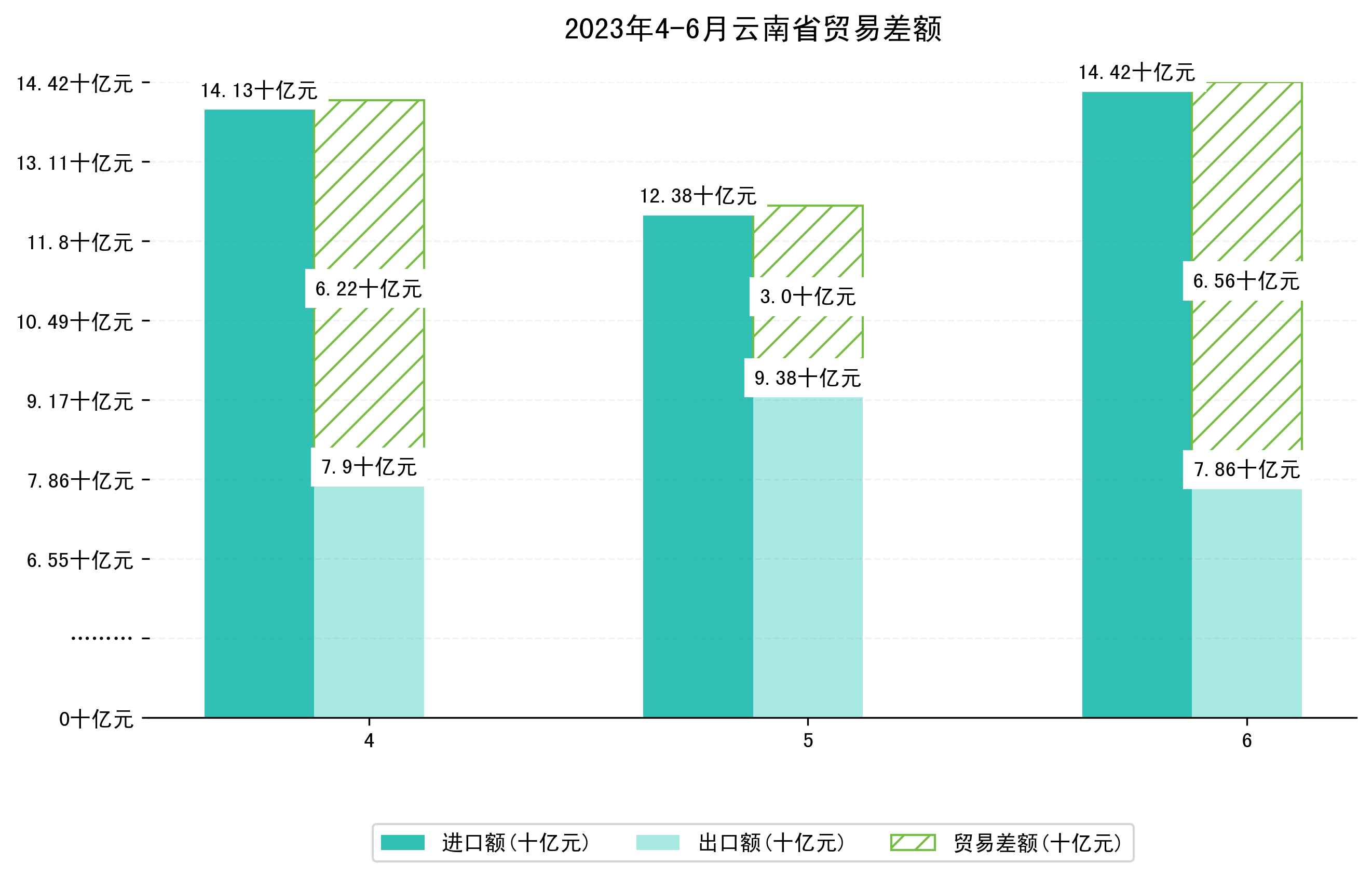 以人民币计,2023年6月云南省贸易差额为65,5833,4355万元(贸易逆差),相比上月减少了35,5381,2776万元,即4,9933,3586万美元;相比上年同期减少了56,2045,9472万元,同比减少599.28%。