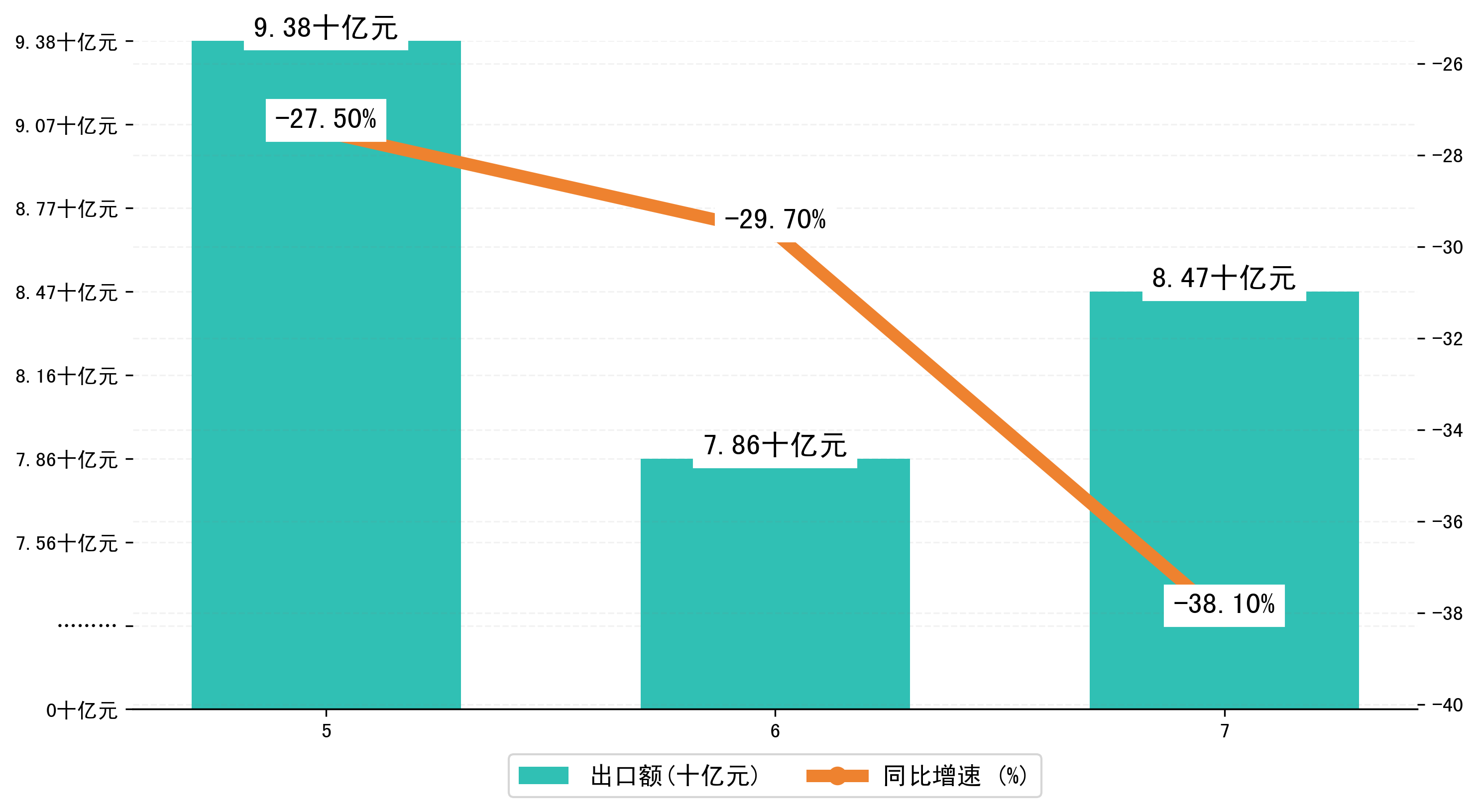以美元计,2023年1-7月云南省出口额为75,2455.8225万美元,相比上年同期减少了61,5133.022万美元,同比减少-41.80%。