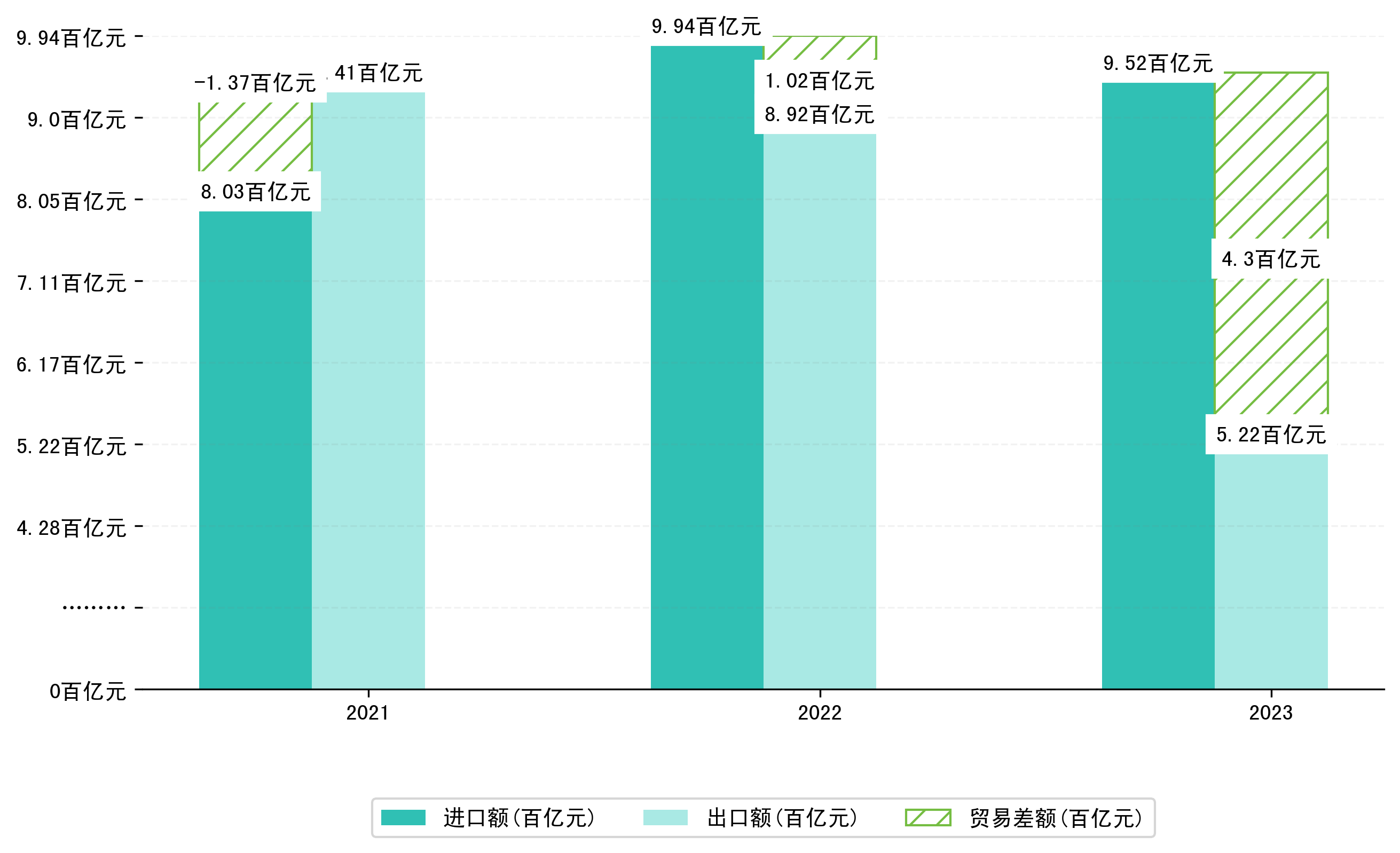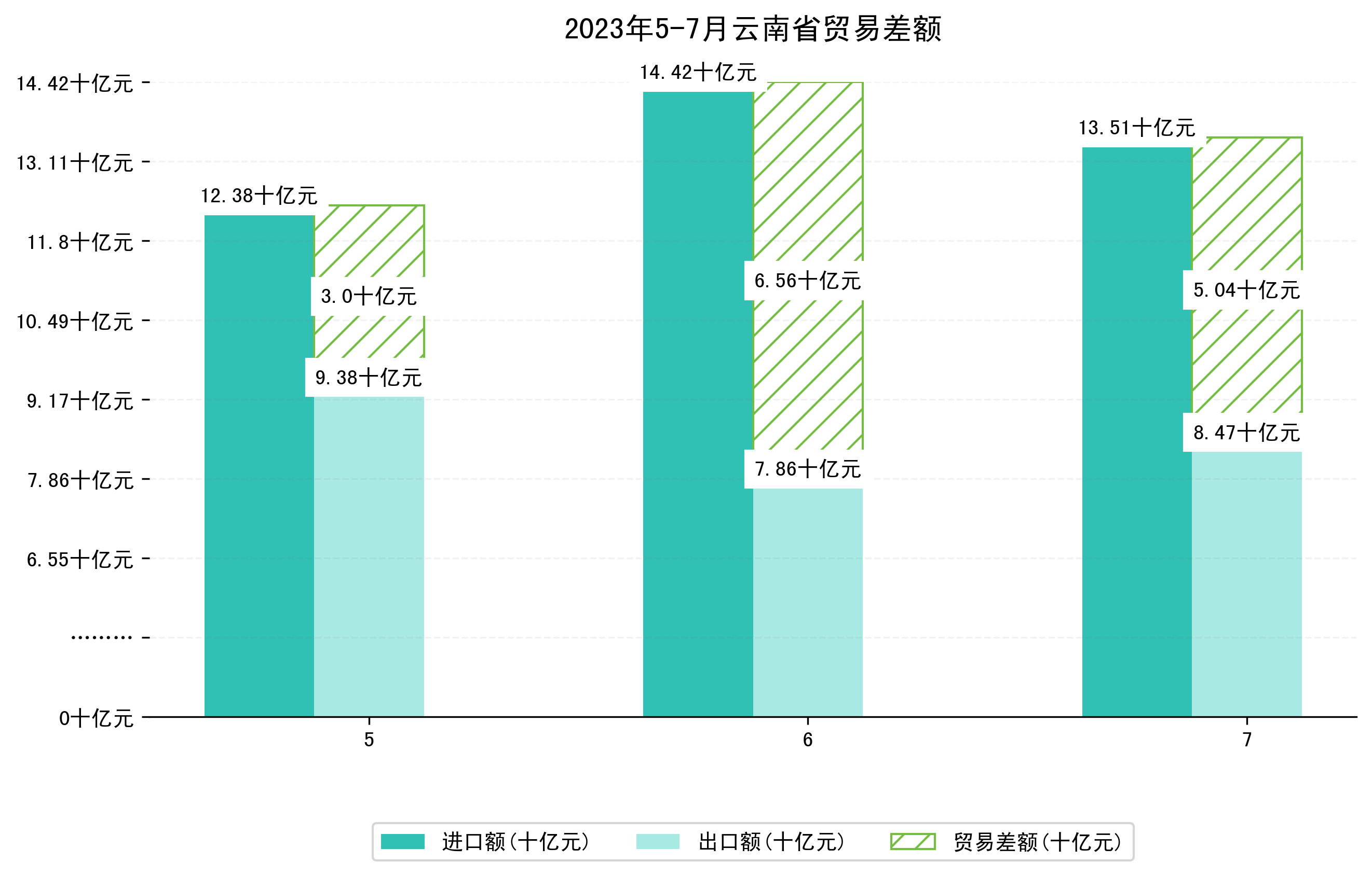 以人民币计,2023年7月云南省贸易差额为50,4064,7687万元(贸易逆差),相比上月增加了15,1768,6668万元,即2,3570,4666万美元;相比上年同期减少了120,0419,9171万元,同比减少-172.39%。
