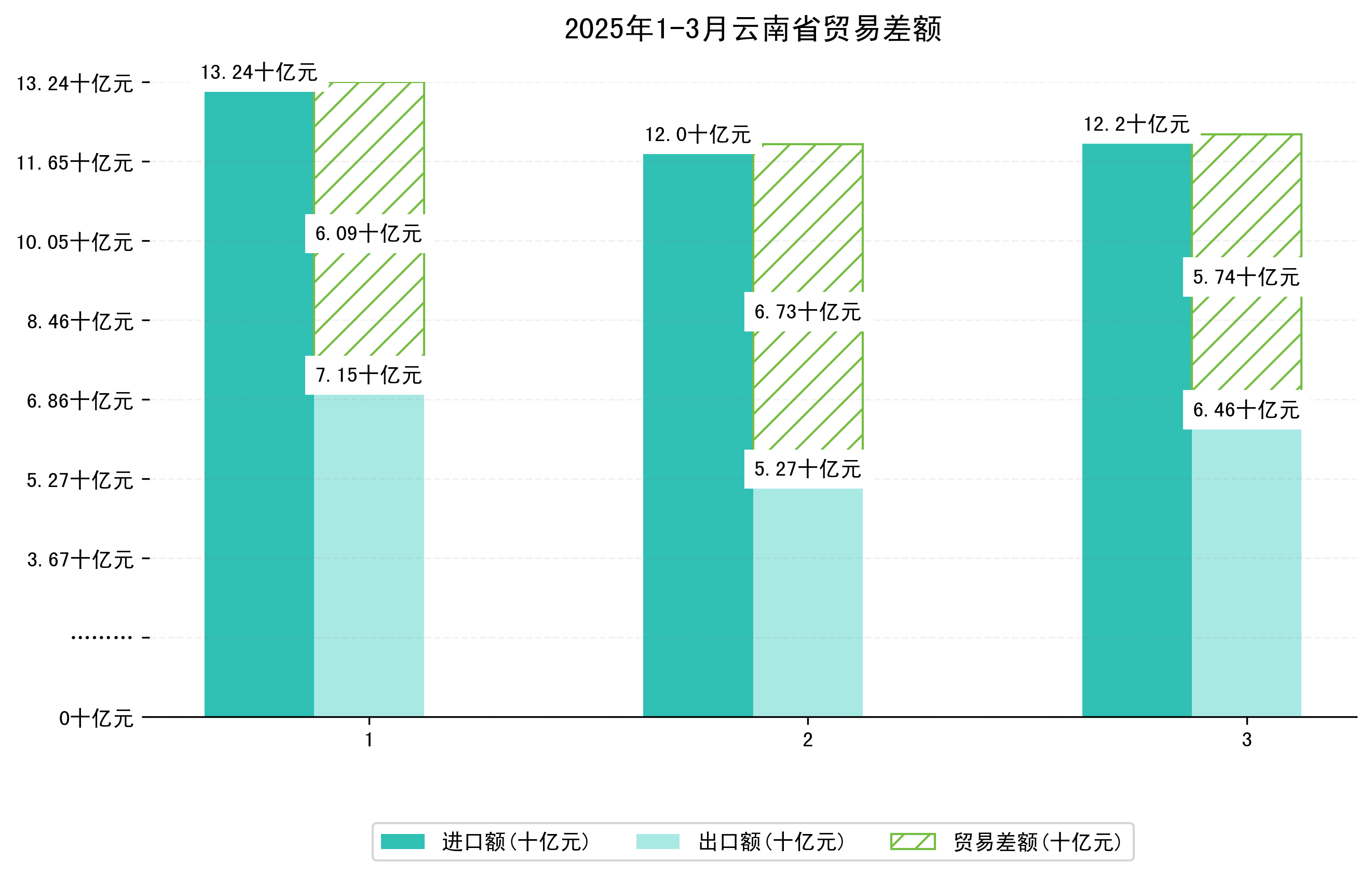以人民币计,2025年1-3月云南省贸易差额为185,6534,3493万元(贸易逆差),相比上年同期减少了14,7419,4052万元,同比减少8.63%。