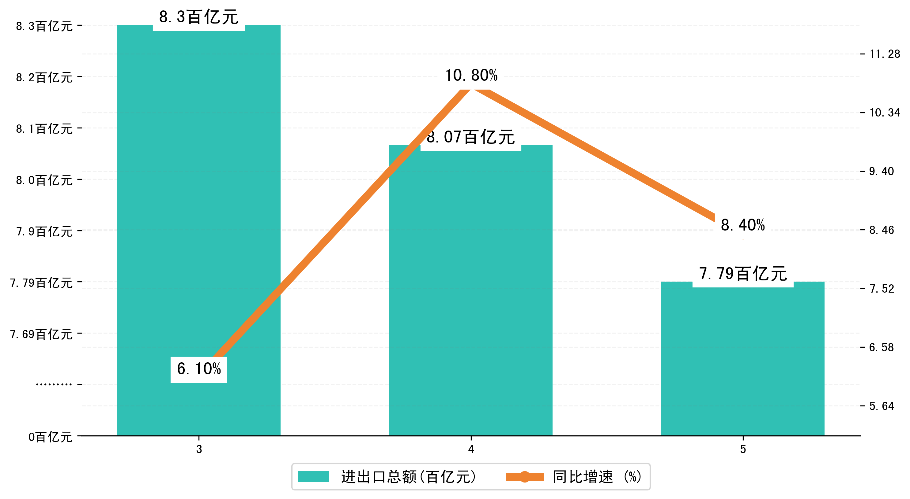 以人民币计,2023年5月青岛市进出口总额为779,2741.1403万元,相比上月减少了27,2512.8508万元;相比上年同期减少了1,8814.8838万元,同比增加了8.40%。