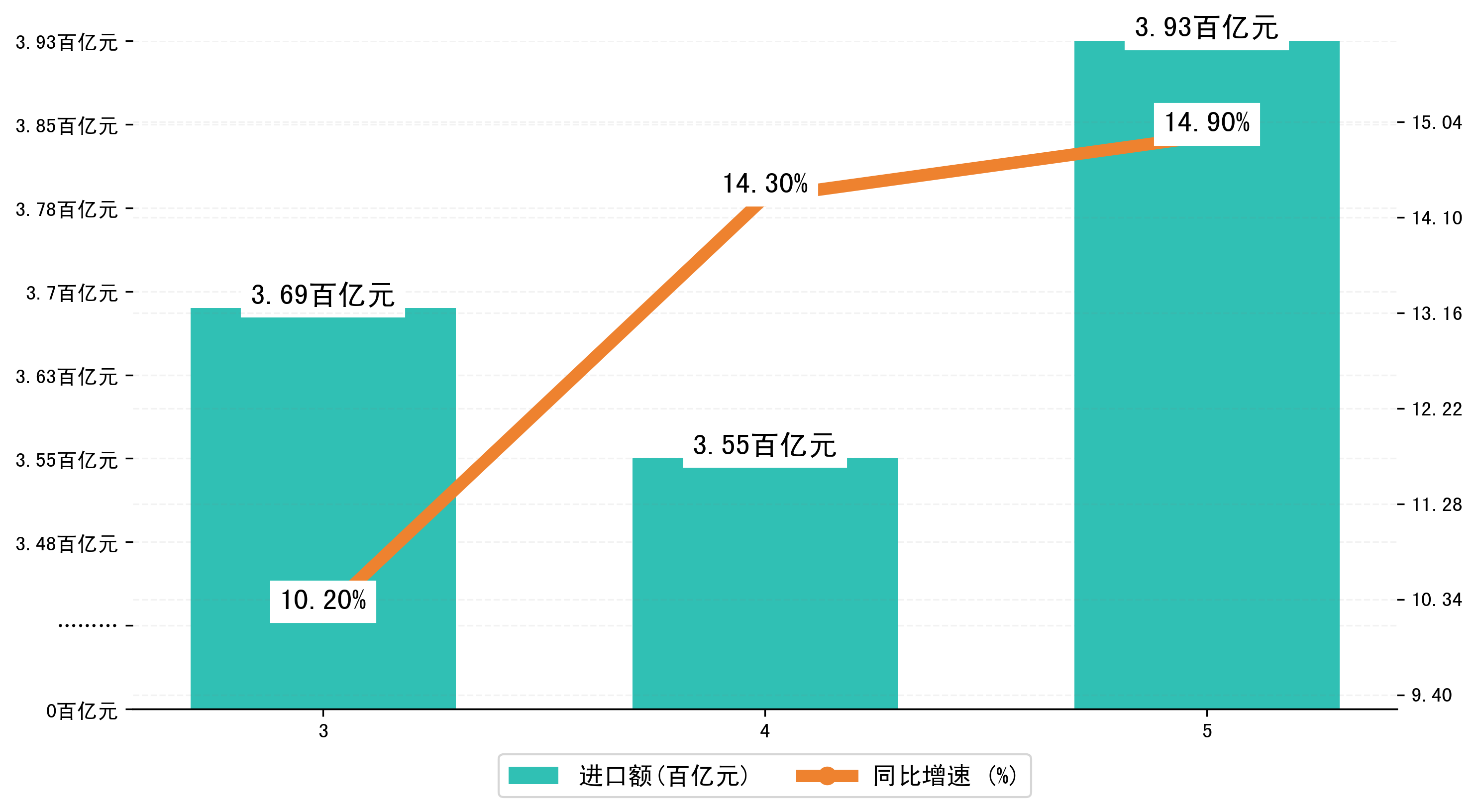 以人民币计,2023年5月青岛市进口额为392,7655.2809万元,相比上月增加了37,6522.5291万元;相比上年同期增加了56,3061.2075万元,同比增加了14.90%。