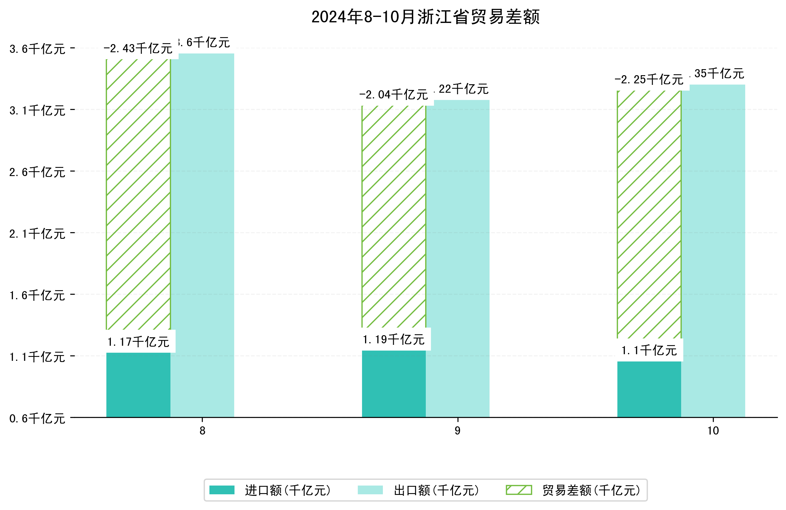 以美元计,2024年1-10月浙江省贸易差额为2987,1934,5853万美元(贸易顺差),相比上年同期增加了294,6648,6204万美元,同比增加10.94%。