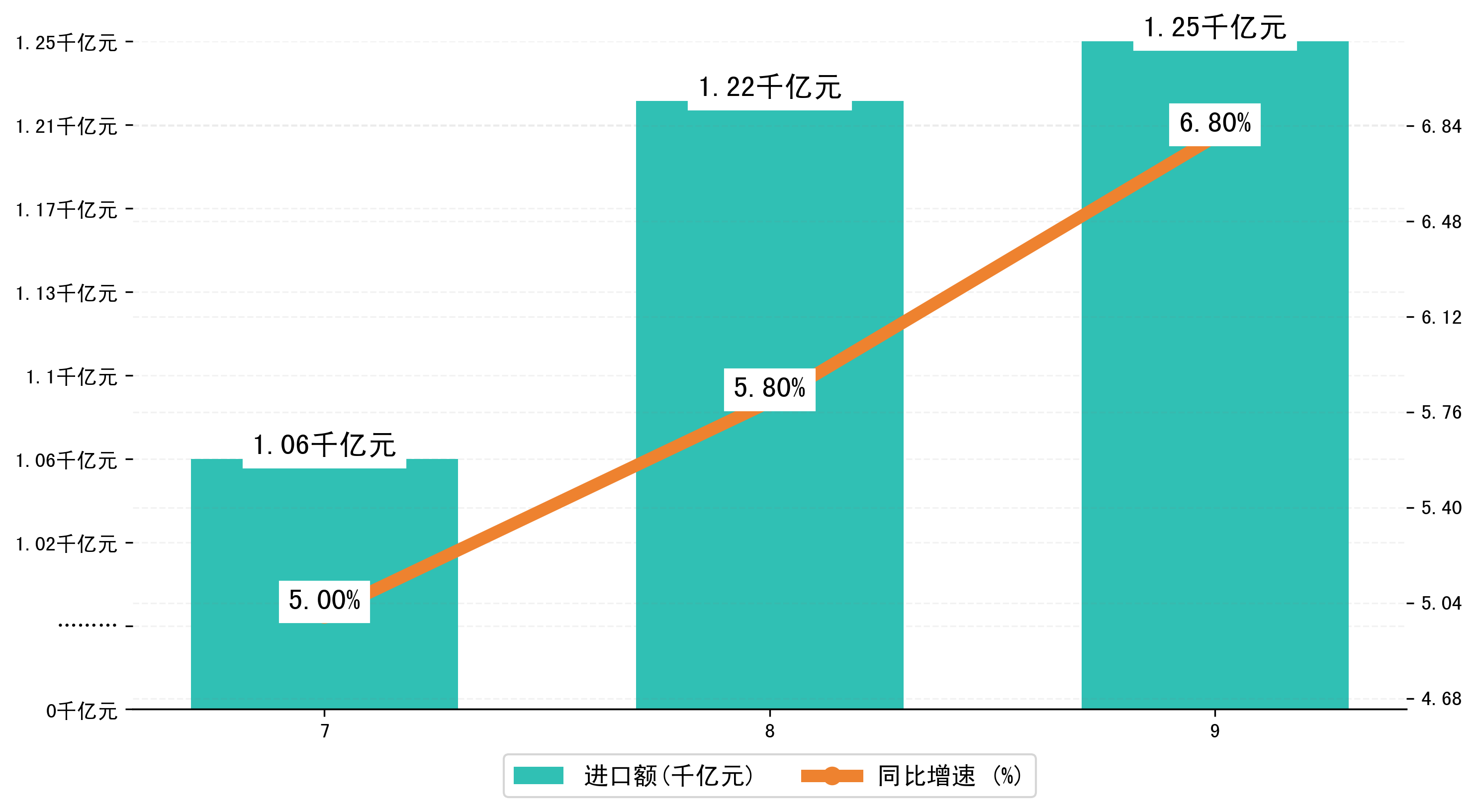 以人民币计,2023年9月浙江省进口额为1250,1993.9652万元,相比上月增加了27,7018.5642万元;相比上年同期增加了148,3609.2986万元,同比增加了6.80%。