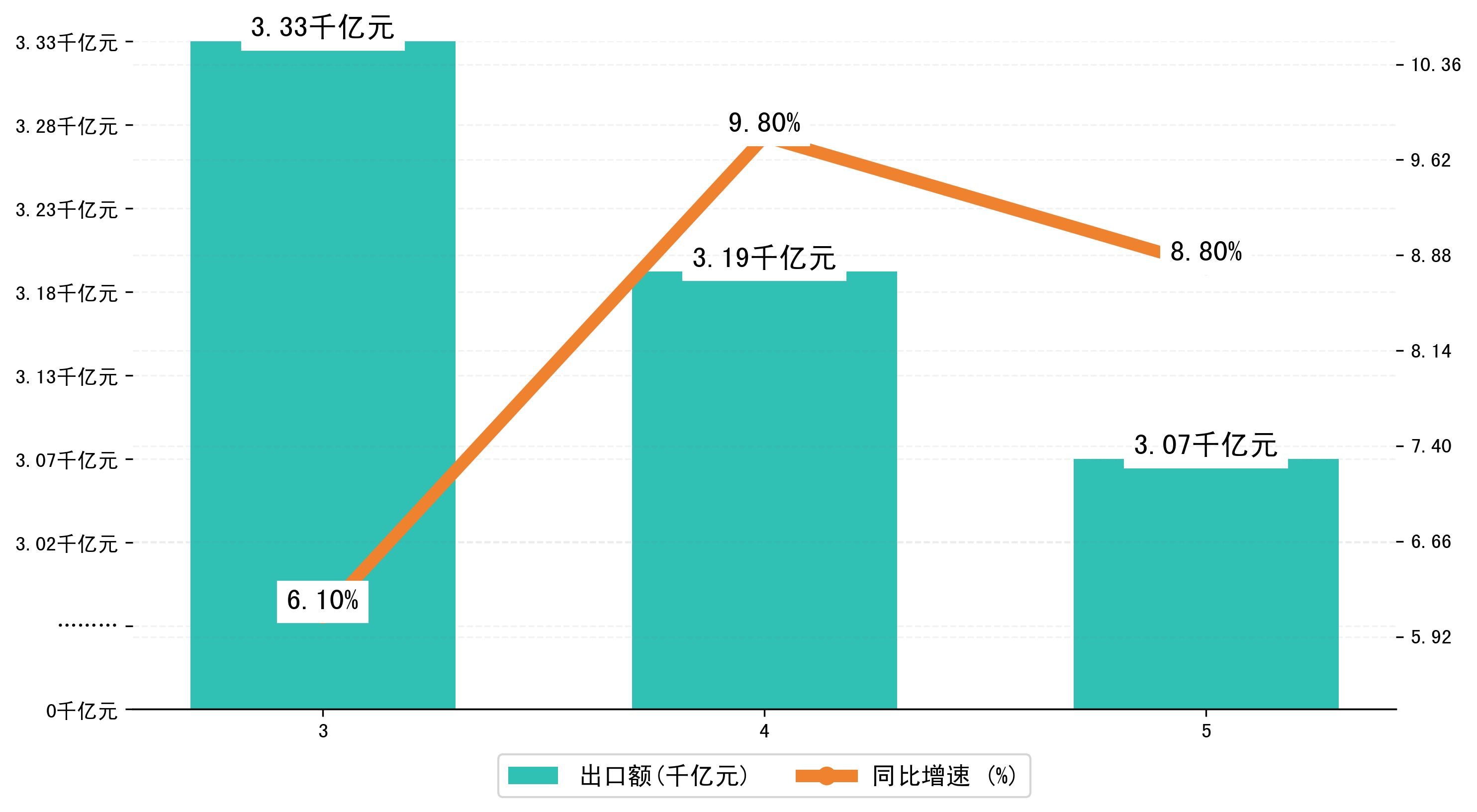 以人民币计,2023年1-5月浙江省出口额为1,4617,7049.6504万元,相比上年同期增加了1172,0250.8459万元,同比增加了8.80%。