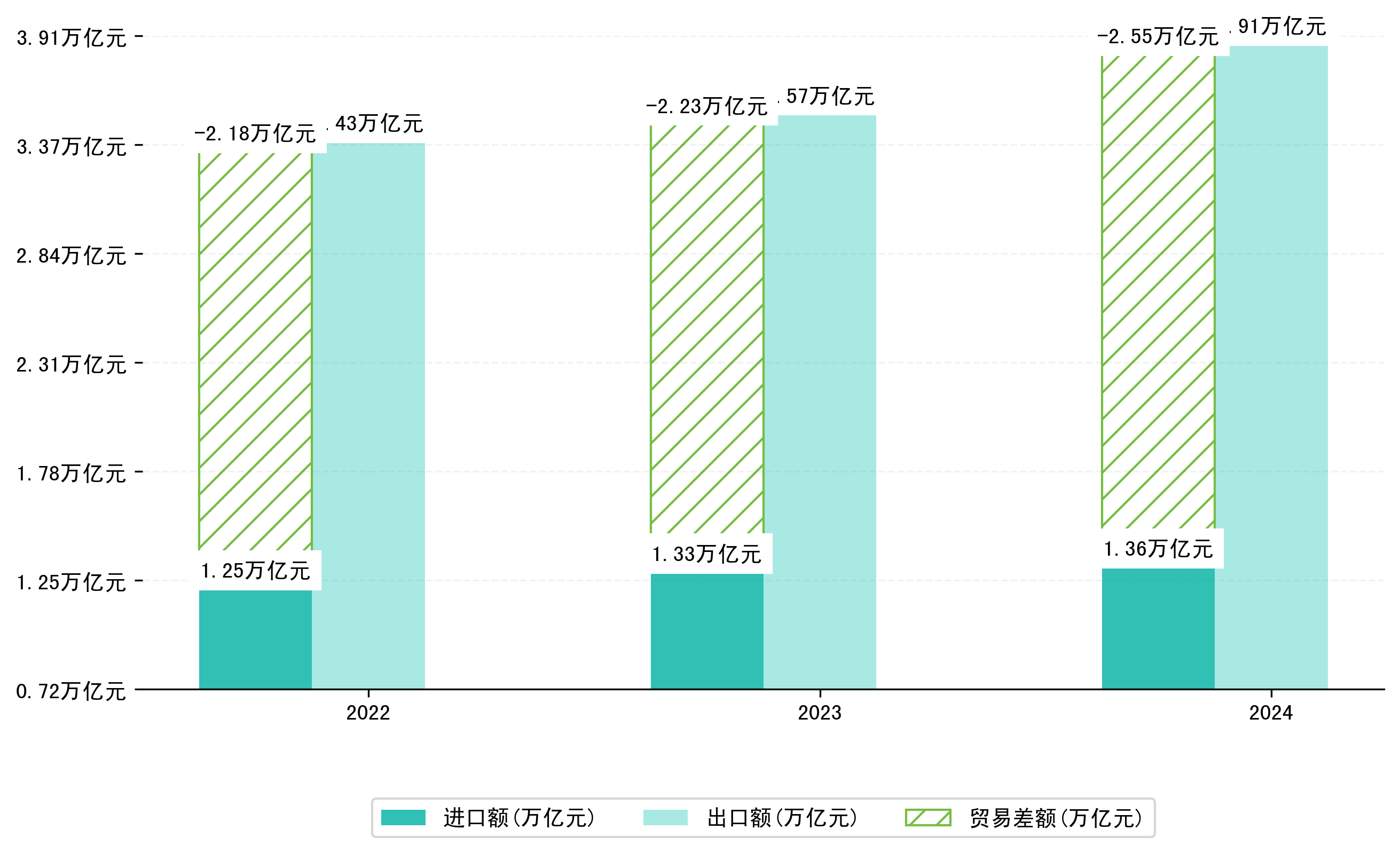 以人民币计,2024年1-12月浙江省贸易差额为2,5473,6728,0409万元(贸易顺差),相比上年同期增加了3140,6371,0534万元,同比增加14.06%。
