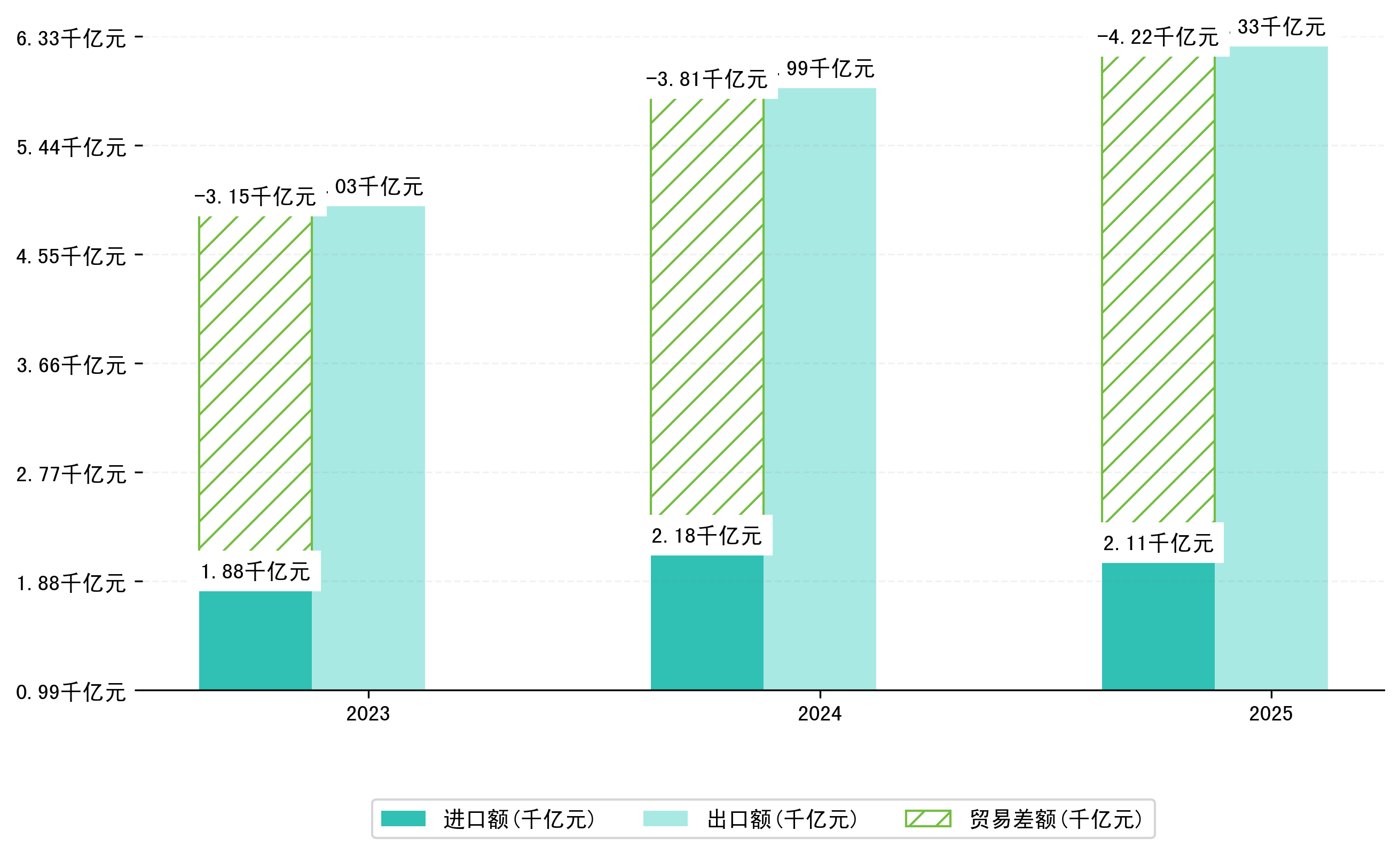 以人民币计,2025年2月浙江省贸易差额为891,5200,3778万元(贸易顺差),相比上月减少了2434,5025,5468万元,即338,5500,6560万美元;相比上年同期减少了458,5848,5136万元,同比减少-33.97%。