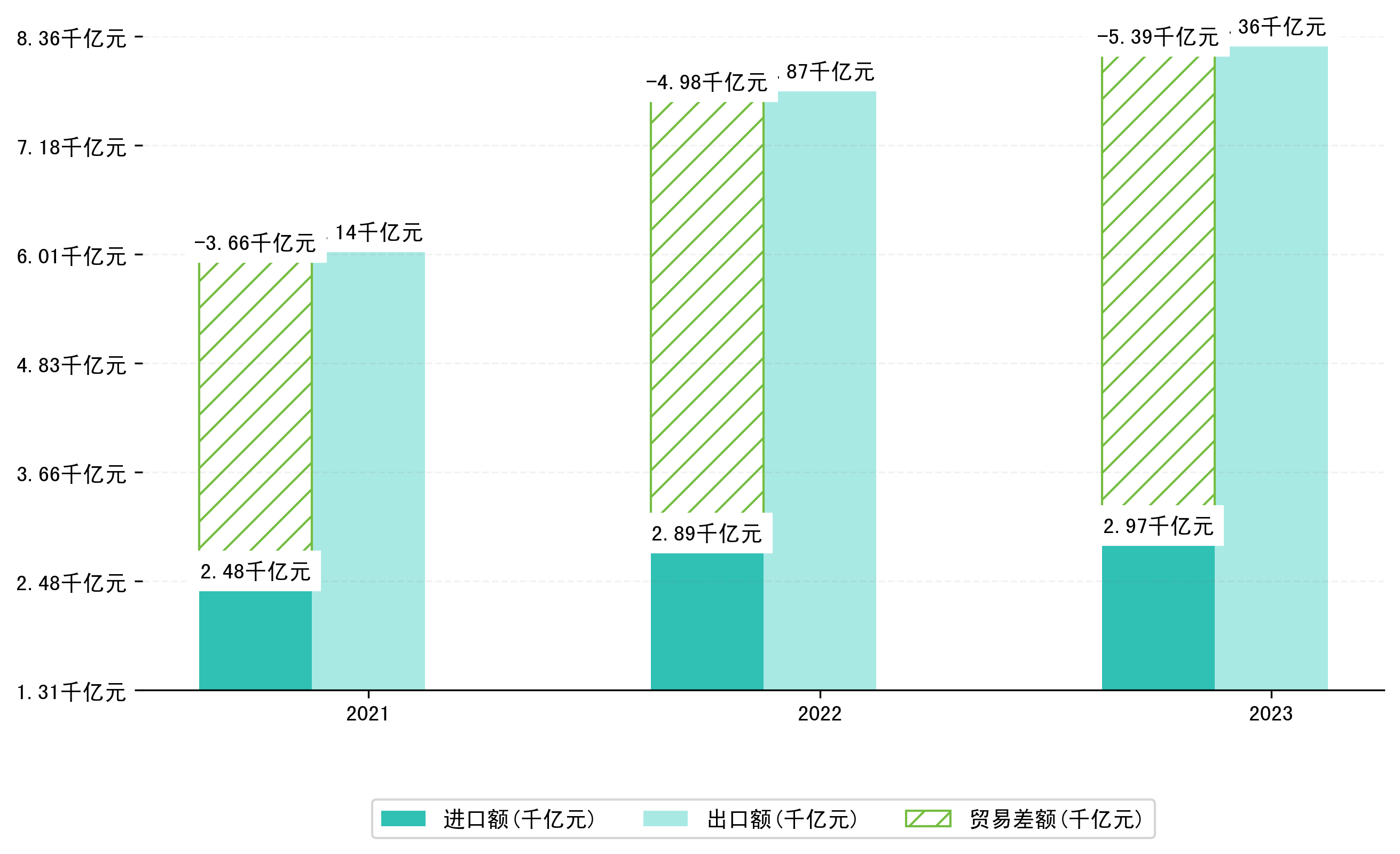 以人民币计,2023年1-3月浙江省贸易差额为5387,4398,1344万元(贸易顺差),相比上年同期增加了405,1825,2900万元,同比增加8.13%。