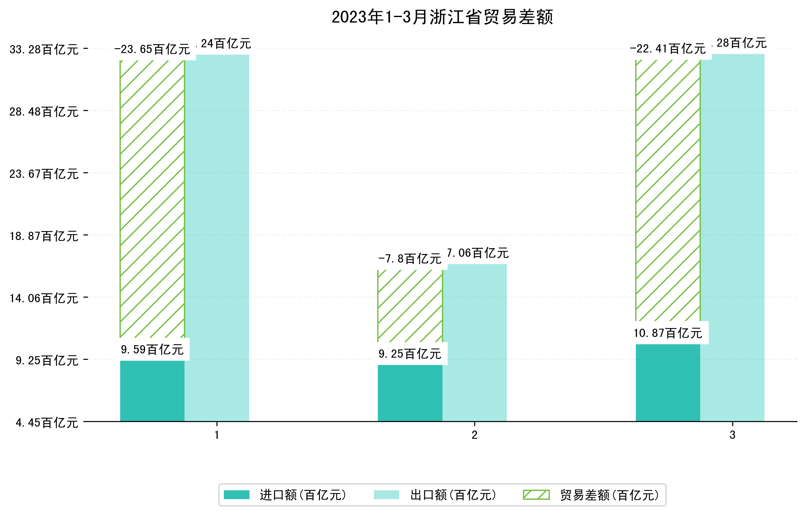 以美元计,2023年1-3月浙江省贸易差额为782,5936,5266万美元(贸易顺差),相比上年同期增加了1972,2714万美元,同比增加0.03%。